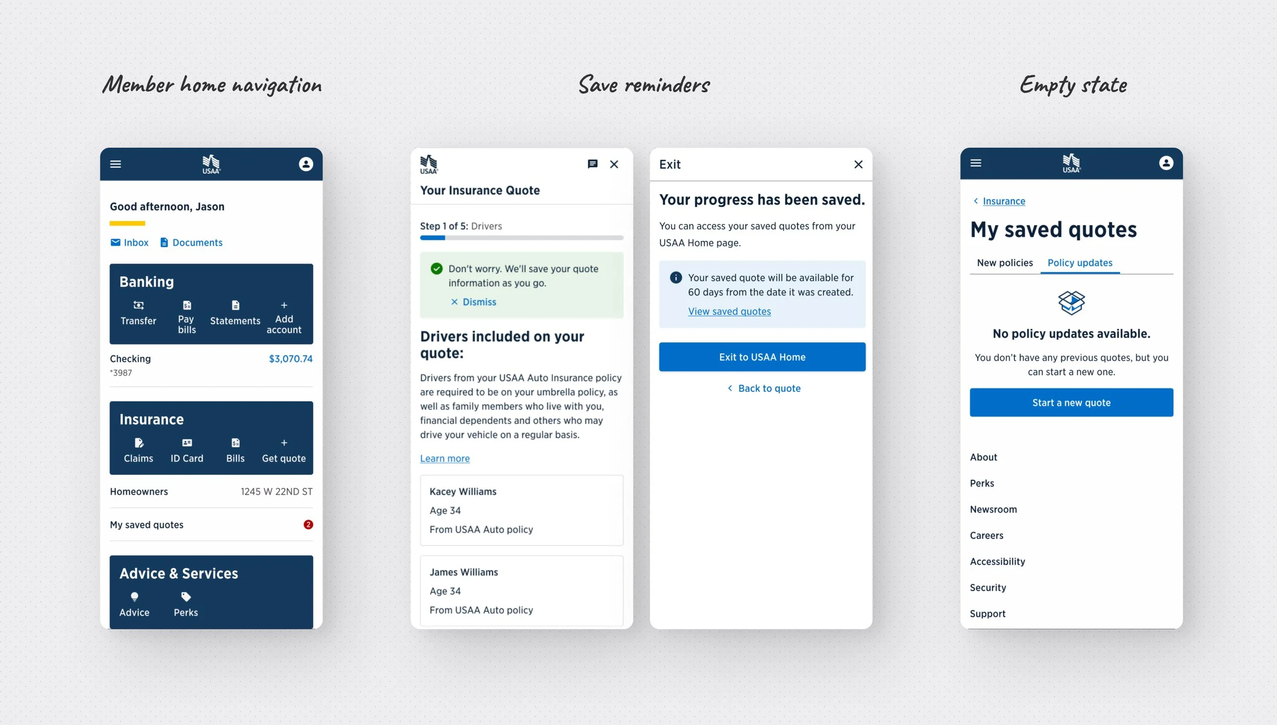 The original scope was limited to the USAA website, with a native app experience to come later. I worked with 5 different product teams and dove deep into the actual quote building experience for each product to understand what was unique and where they overlapped. I also spent time with experts in our backend policy-building and saving system to understand the various stages of completion a quote might be saved in.