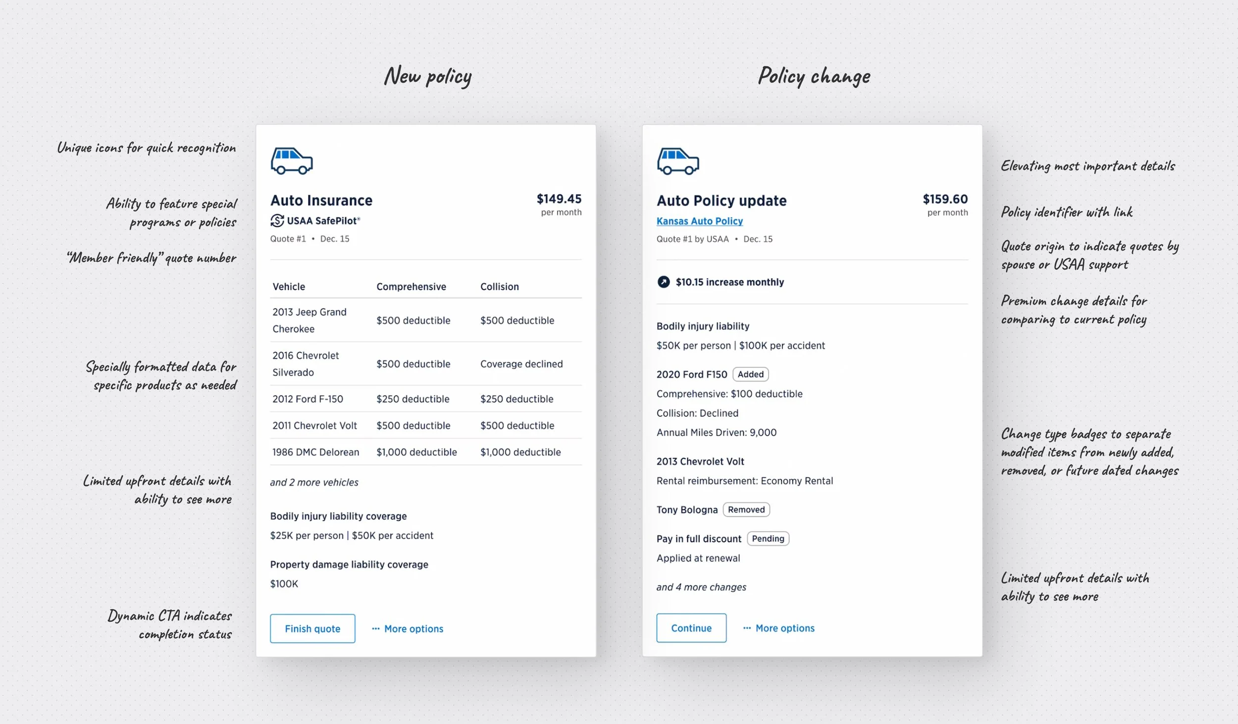Based on member feedback we knew comparison features were desirable, but we did not have capacity to build a full fledged tool for that any time soon. To bring the most value out of our MVP I pushed for displaying relevant details up front to enable side-by-side compare-ability. Insurance products contain a large number of configurable options, so we used survey data and policy data to determine which information was most important for users when reviewing saved quotes. We also used policy data to define limits and prevent information overload, i.e. 95% of auto policies have less than 5 vehicles so we prioritized showing no more than that many vehicles in the default view. By leading with quote details we also eliminated the need for custom quote names, a feature that was rarely if ever used. If members wanted more details, we added the option to open an expanded details view without entering the quote flow, enabling deeper dives while staying in context of the hub.