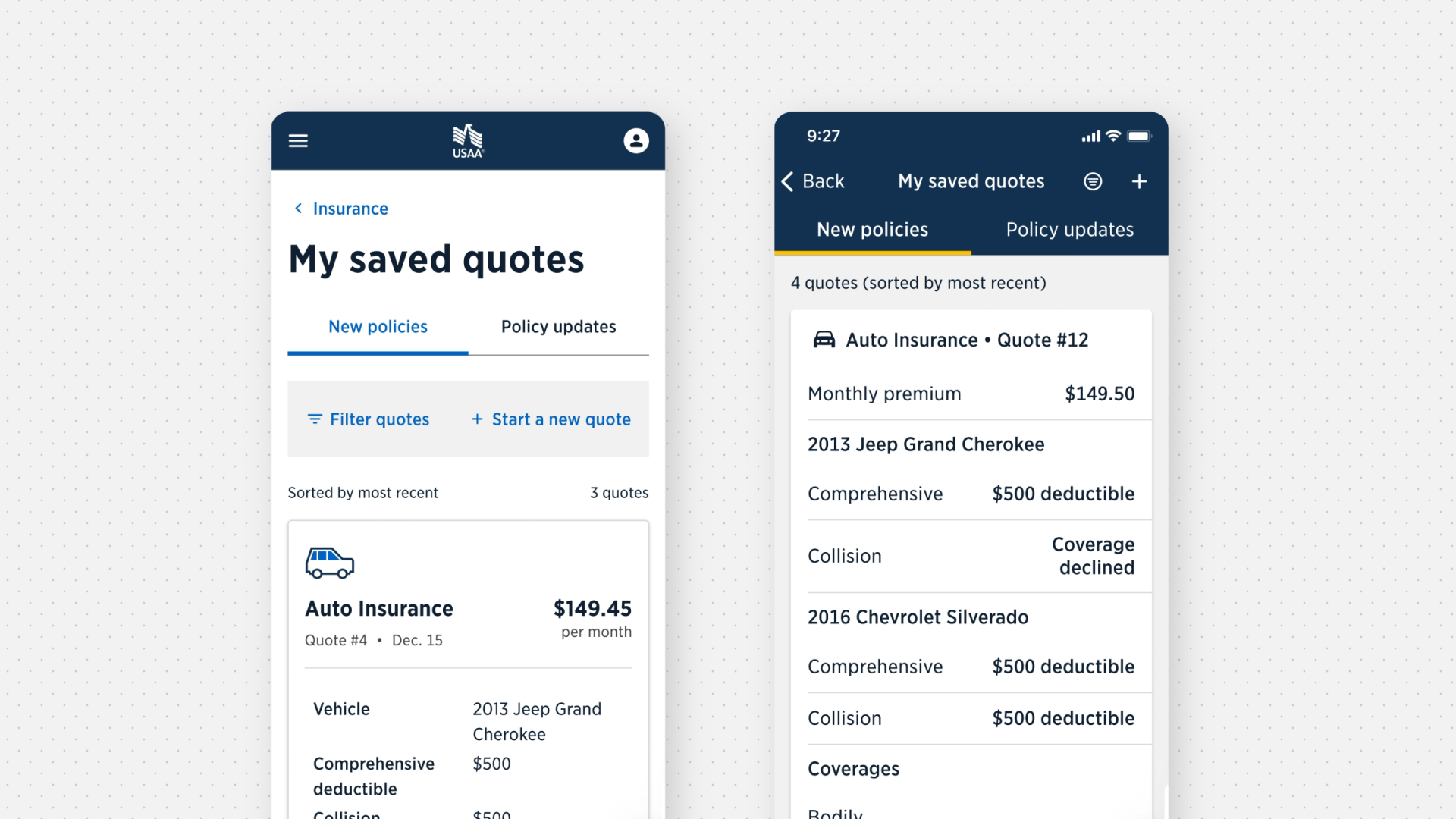 Managing saved insurance quotes was a frustrating experience for USAA members. Quotes were scattered across nine different product pages, difficult to locate, and nearly impossible to compare without opening each one individually. As a result, members frequently engaged with phone support multiple times just to complete a purchase. This project will explore how a new centralized, self-service quote hub reduced member effort to locate quotes, improved clarity across products, enabled easier comparison, and ultimately lowered support costs.